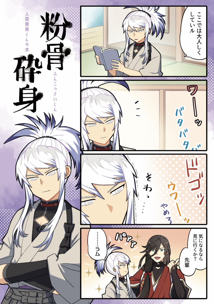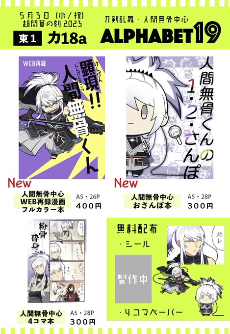 【5月3日新刊サンプル2】 Twitter・pixivにアップしていた人間無骨中心のWEB再録本です。ほのぼのギャグや茶を点てる話などを収録。 オールカラーです。 (※書き下ろしはありません。) 『顕現!!人間無骨くん』 ■A5/26P/400円(イベント価格) よろしくお願いします! pixiv.net/artworks/10738…