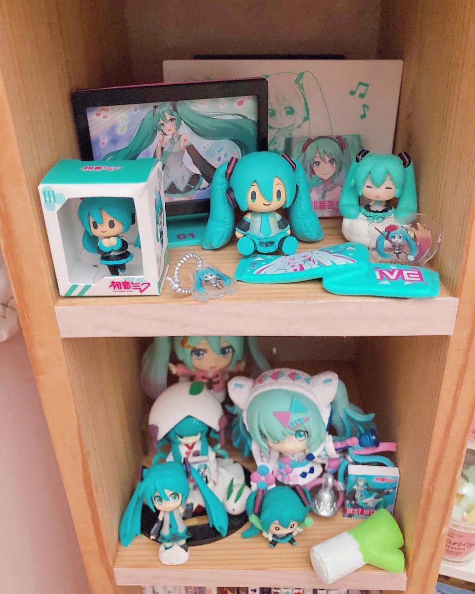 日向ちゃんは部屋で過ごしています。 新しい初音ミクリーメントシリーズを買ったのでドールルームの棚にアレンジしてみました🎶💚 #みるっ子 #MDDはいいぞ #初音ミク