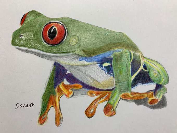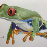 イロドリアルさんの色鉛筆画上達ドリル 動物編よりアカメアマガエル。かなり手強かったです😅💦 石川先生のような綺麗な発色にはなりませんでした。鉄筆はちょっと細かかったかも。 お腹のウロコ部分とか細かくて大変でした。自分的にはこれで限界です… #イロドリアル #色鉛筆画上達ドリル動物編