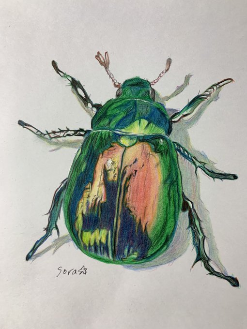 イロドリアルさんの色鉛筆画上達ドリル 動物編よりコガネムシを描きました。 立体感を出すって難しいな😅💦 自分なりに考えて描いてみましたが、いまいち納得する絵にはなりませんでした。何が足りないのだろう? #イロドリアル #色鉛筆画上達ドリル
