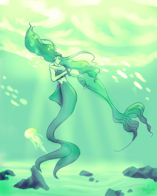 #mermay Day 23 -warrior I was not qualified to do an action scene in such a short time. so you get a final rest. #artnouveaumermay apatite, which come in many color but I choose blue here. #wacommermay2022 #mermayxmermaze #mermay2022 #mermaychallenge2022