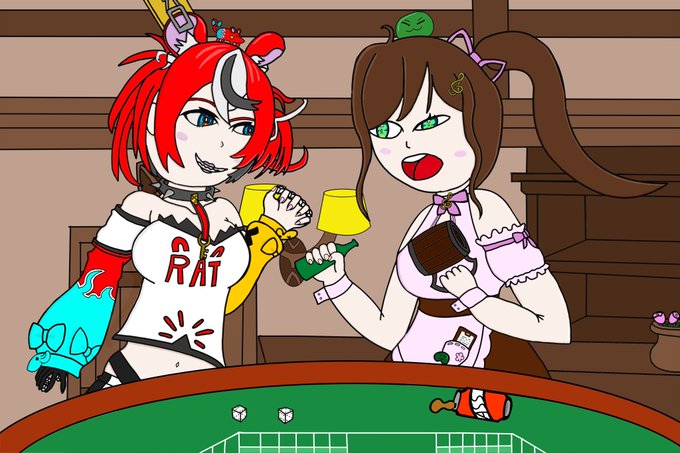 Here is a doodle of mio and bae in the tavern drinking and playing with dice. I started this right after the collab was announced, but having work slows art alot. And since it was a while since I did digital art I got slower and worse. Hope you like it #miorillust #illustrayBAE