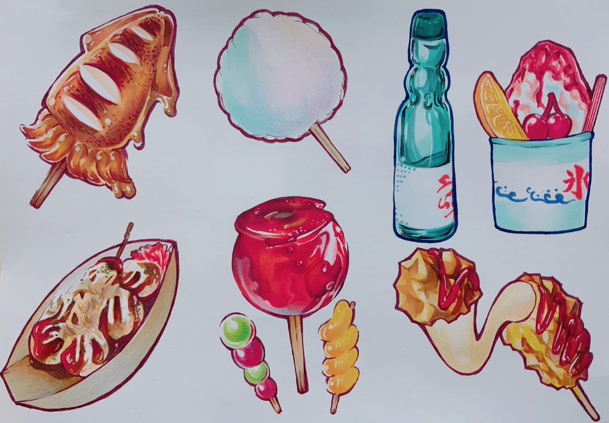 夏をテーマにシールのデザインをしました! コピックで描きました夏祭りの出店の食べ物達です! 美味しそうに可愛く…を目指して頑張りました!(●︎´▽︎`●︎) #絵描きさんとつながりたい #コピックイラスト #コピック #夏の創作クラスタフォロー祭