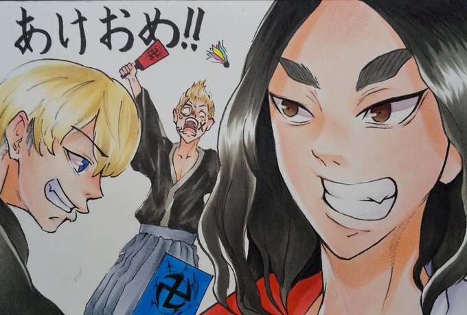年賀状イラストPart.3! コピックで東京卍リベンジャーズから場地さんと千冬と武道を描きました!!! 和やかな雰囲気が伝わればなと思います(◍︎´꒳`◍︎) #絵描きさんと繋がりたい #東京卍リベンジャーズ #年賀状イラスト #コピック