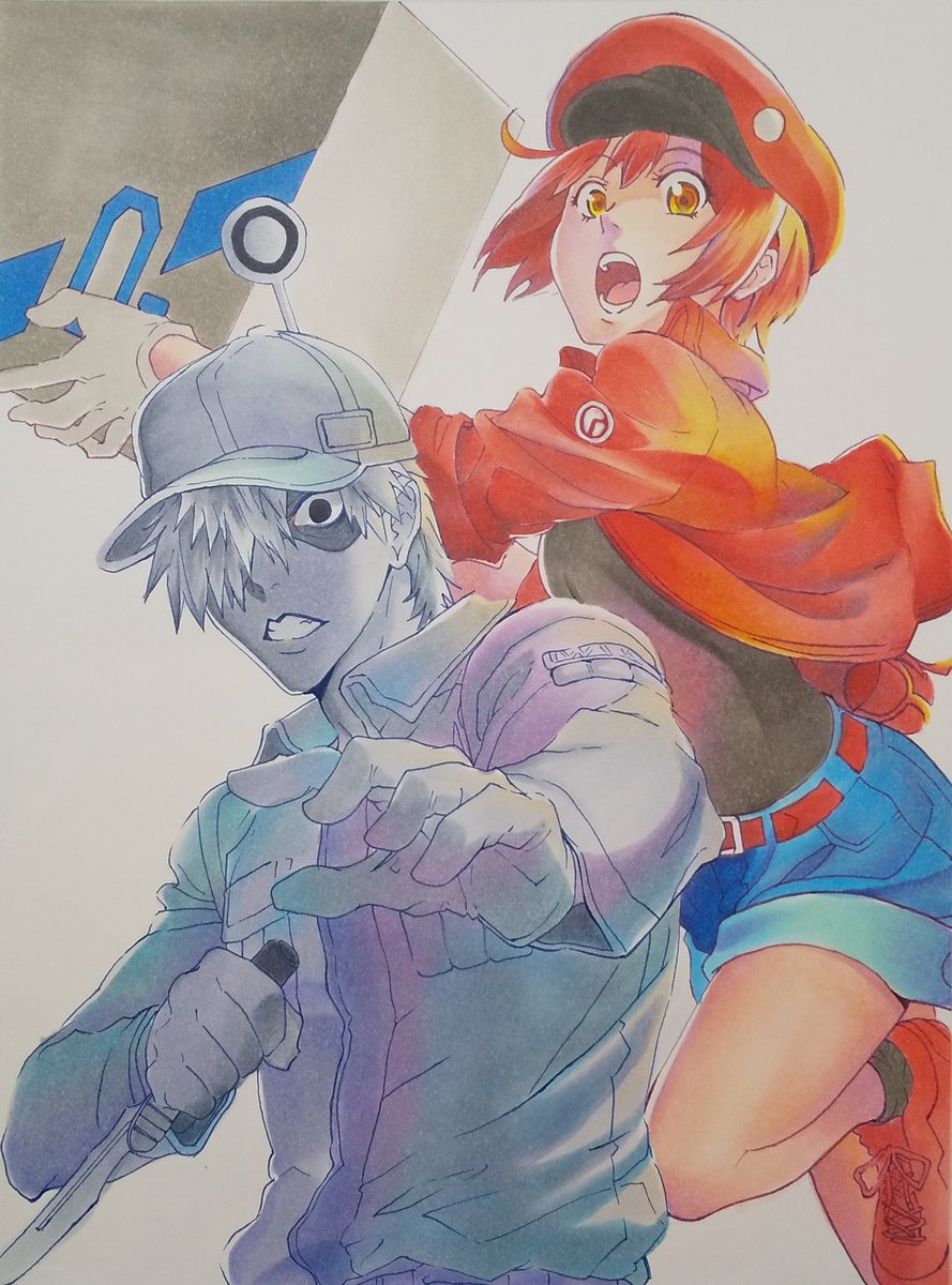 はたらく細胞!!の放送開始を記念し…過去絵ですがコピックで赤血球と白血球さんを描きました! 2期1話目が血小板ちゃんメイン話なのめっちゃ嬉しかった♡ うしろまえちゃん可愛いぃ〜(*´﹃`*)♡♡ #絵描きさんと繋がりたい #コピック #はたらく細胞