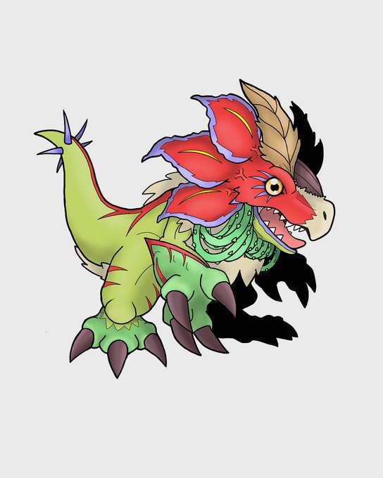 Dilophomon. Adulto/Champion. Vírus/Virus. Planta/Plant. Jungle troopers-Nightmare soldiers-Nature spirits. #Digimon #Fanart #デジモン #Fakemon #DigimonGhostGame #DigimonSurvive #Digimonoc #Digimonart #Fandigimon #plantdigimon #dinosaur #Digifake