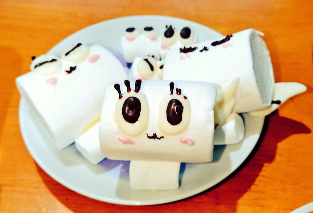 #しろっぽ でっかいマシュマロとマシュマロとチョコでワイテルくん作ってみました! まつ毛は折れた リトライ案件