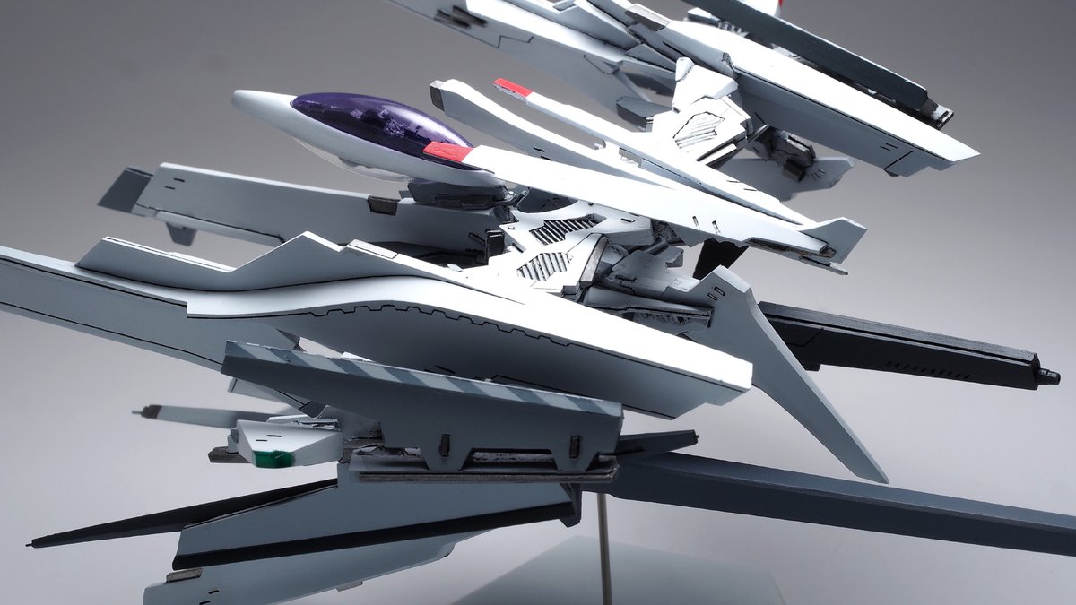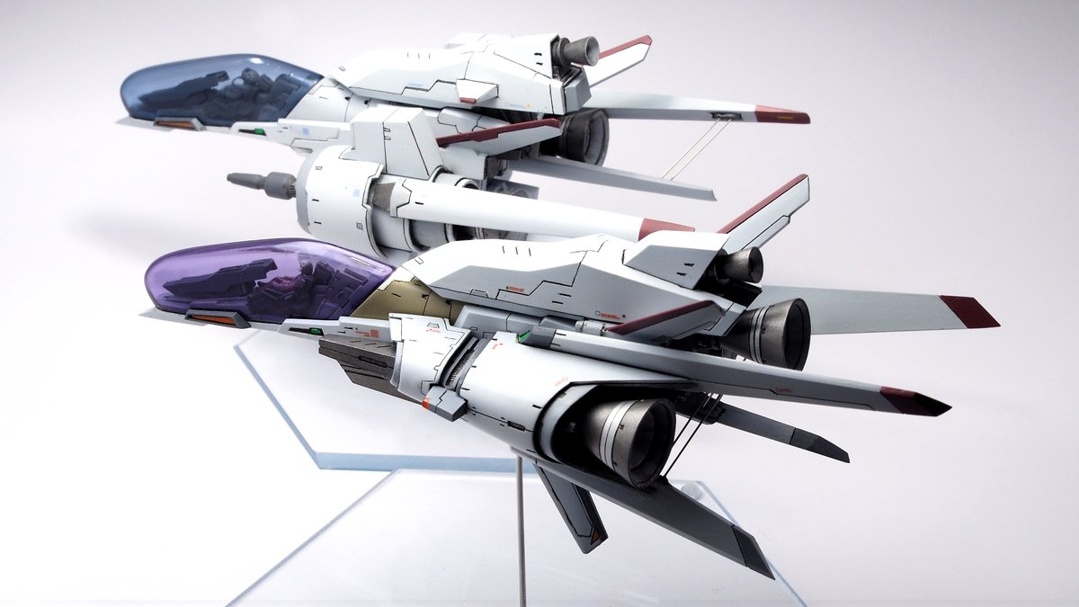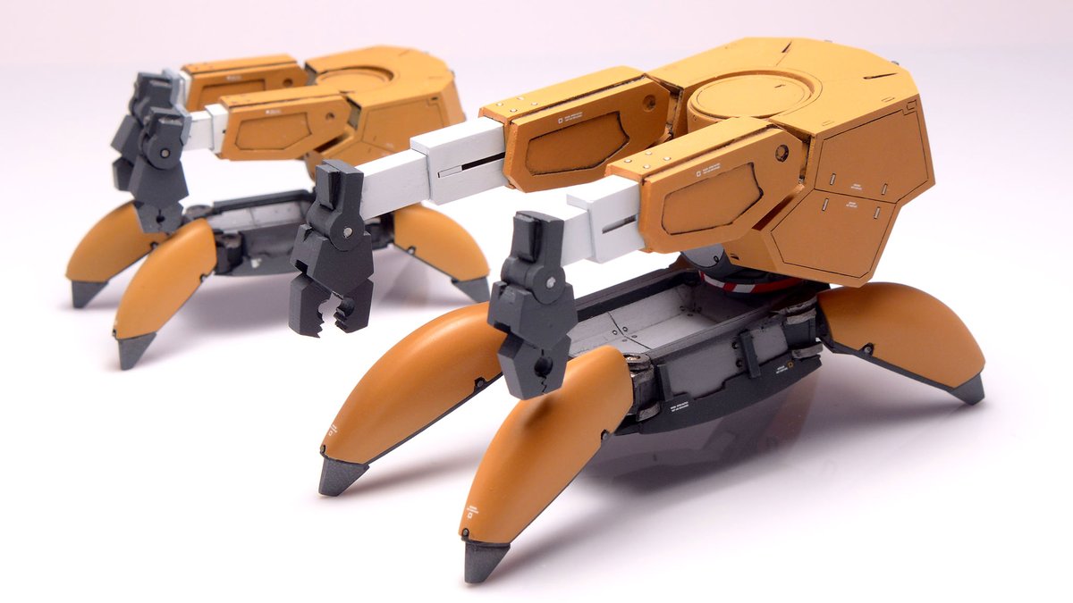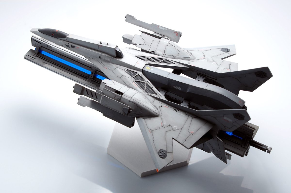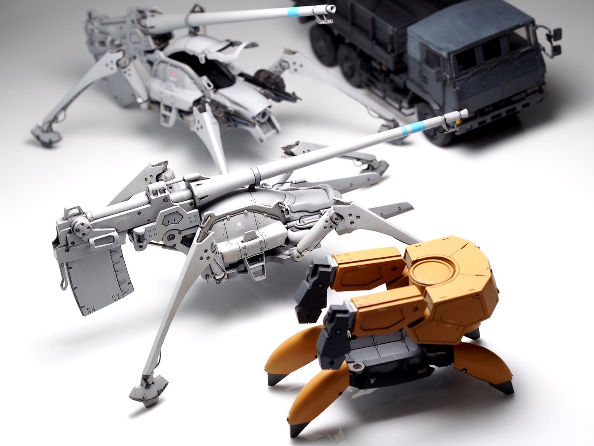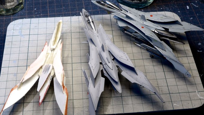 ①プラ板で組んだラフ・デザイン/試行錯誤の段階 ②原型を経てレジンパーツとなって組んだ物・サフ状態 ③完成品。 ラフのてきとう具合がひどいが、最初はどれもこんな程度 #これを見た人は塗装前と塗装後を貼れ