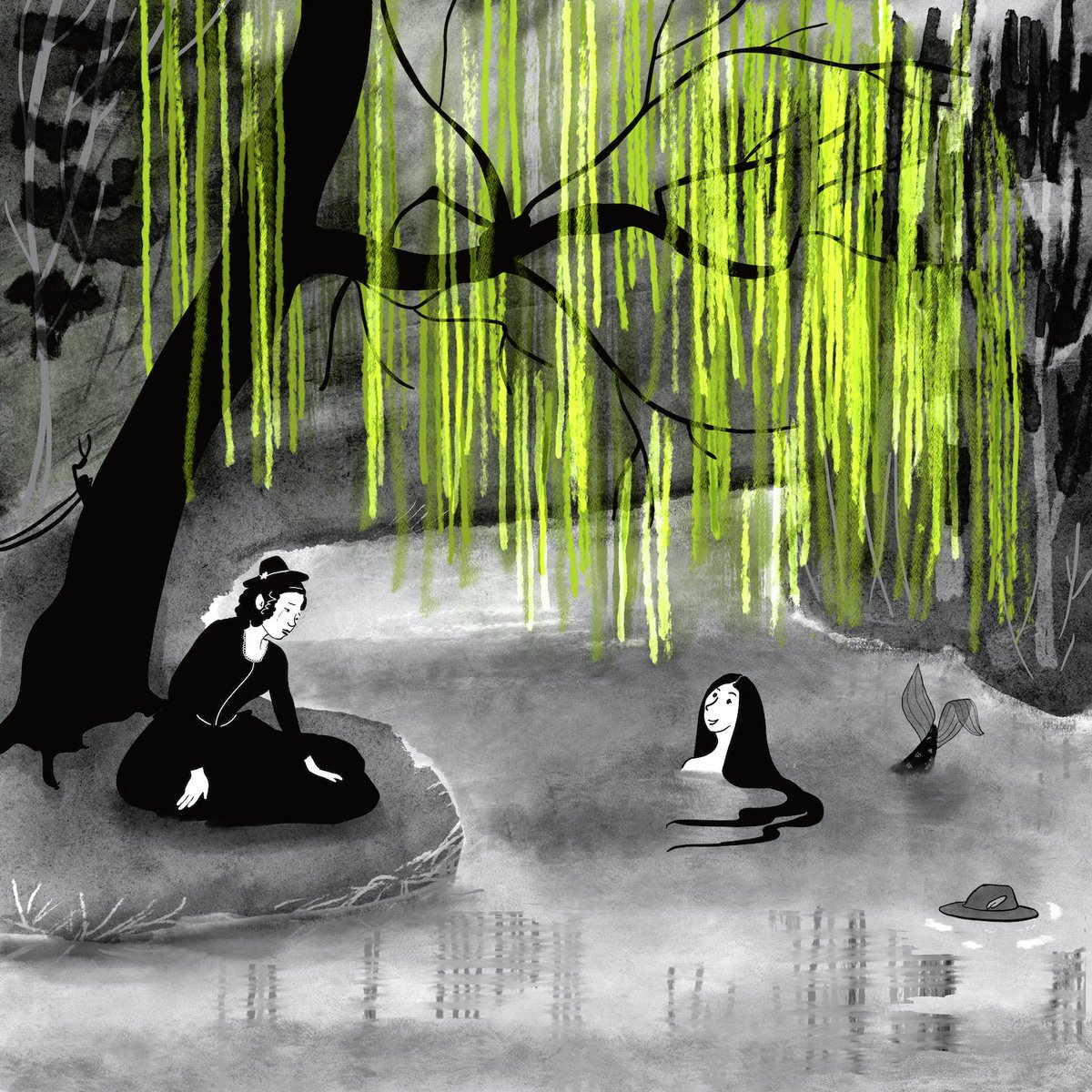 She sat down by the river bank and began weeping. The mermaid emerged from the water and comforted her by telling her that her husband was comfortably living below. (does anyone believe the mermaid?) #inktober2021 #mermaids #fairytales