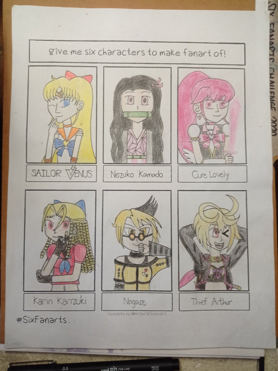#sixfanarts fully accomplished. @thebirb - Sailor Venus @zzyyrrll - Nezuko Kamado @HopeIris_ - Cure Lovely @GustavoMarcha19 - Karin Kanzuki @NintenCano - Nagase @SpeedStar1642 - Thief Arthur I humbly apologize for such hiatus. Architecture school made me busy.