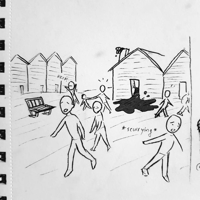 Inktober day 29: uh-oh Perspective drawing of the burning bookshop! This took ages to make. Some process videos in thread. #inktober2022 #GoodOmens #GoodOmensFanArt