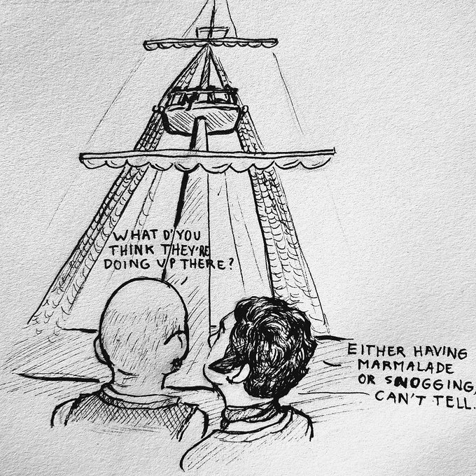 Inktober day 9: nest When Ed and Stede were dressed in each other's clothes and sharing food on the ship's crow's nest... 🏴☠️🖤 #inktoberday9 #inktober2022 #ourflagmeansdeath #OFMDfanart