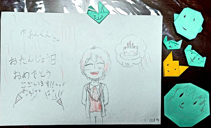 お誕生日おめでとうございます🎉 10歳の娘(絵+上の折り紙)と5歳の娘(右の折り紙)からのお祝いの気持ちです🎂 #からぴち @YuaPyoon #ゆあんくん誕生祭2022