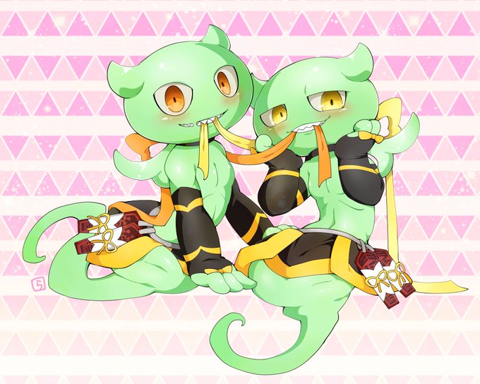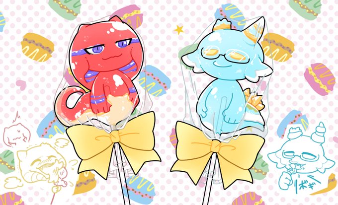 3 7 【過去絵】 ナガイとサフィアスの飴細工🍭 いちごヨーグルト味とソーダ味です💛 口の中を怪我しそうな形ですね。 23/03/20 00:01