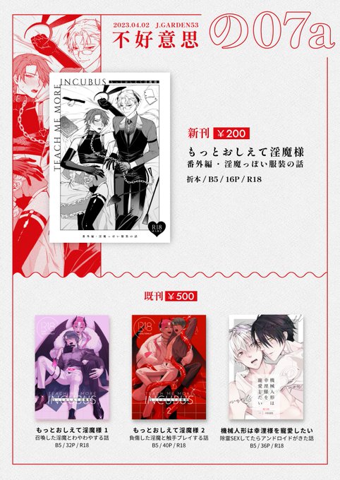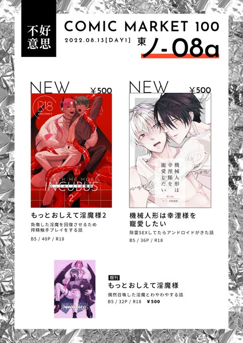 C100のお品書きです!よろしくお願いします🙏 スペース:1日目東ノ08-a ↓新刊サンプル pixiv.net/artworks/10011… pixiv.net/artworks/10026… #創作BL #C100 #C100お品書き