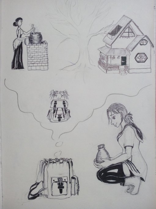 Day 4: Home In the backpack you can find not only useful items for the traveler, but also pleasant memories of home #WitchyCafeScribbles #cglabtober #inktober #inktober2021 #ArtistOnTwitter #арт #рисунок #witch