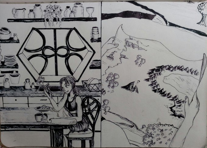 Day 5: Kitchen and Map In home/ On the road #WitchyCafeScribbles #cglabtober #inktober #inktober2021 #ArtistOnTwitter #арт #рисунок #witch #Map