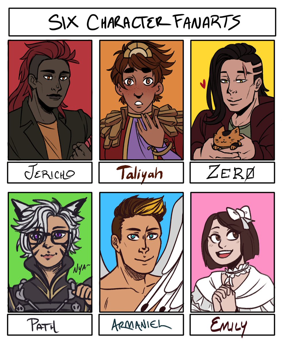 My semi-delayed take on the #SixFanarts challenge! Most of these are oc's from friends with also a Taliyah and Emily mixed in🥰