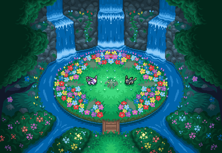 ~ Cascade Forest ~ i listened to cascading petals by @sab_irene a few months ago and it reminded me of the ost for some of the friend areas from pokemon mystery dungeon red rescue team, so i thought i’d try creating my own based on the song vibe #pixelart #pokemonmysterydungeon
