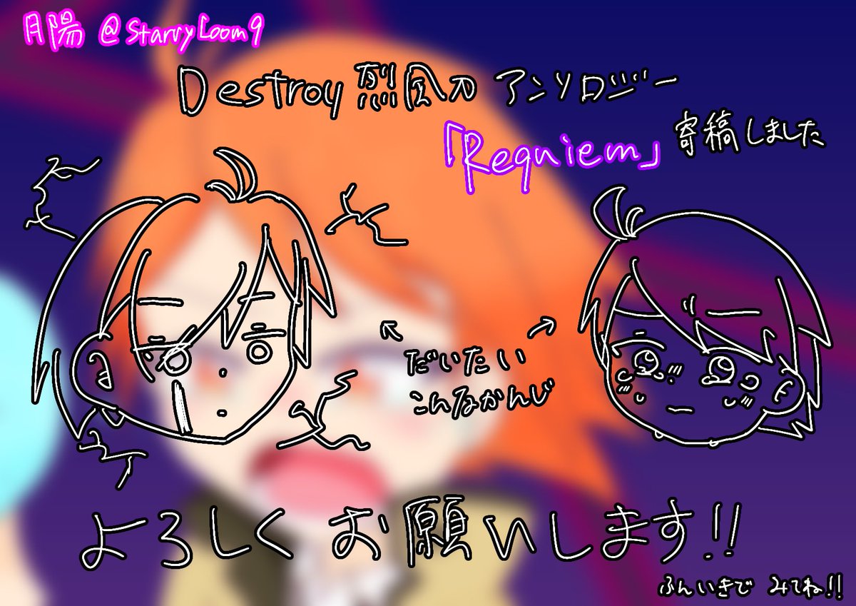 梅竹さん主催のDestroy烈風刀アンソロジー「Requiem」にイラストを1枚寄稿させていただいてます! Ⅲのストーリーep.15をイメージしながら、兄弟の緊迫した近接戦を描きました🙌たくさんの名だたる方々に囲まれて恐悦至極です…!よろしくお願いします!! なお月陽自身はバドエン厨です。 twitter.com/plum_bamboo612…