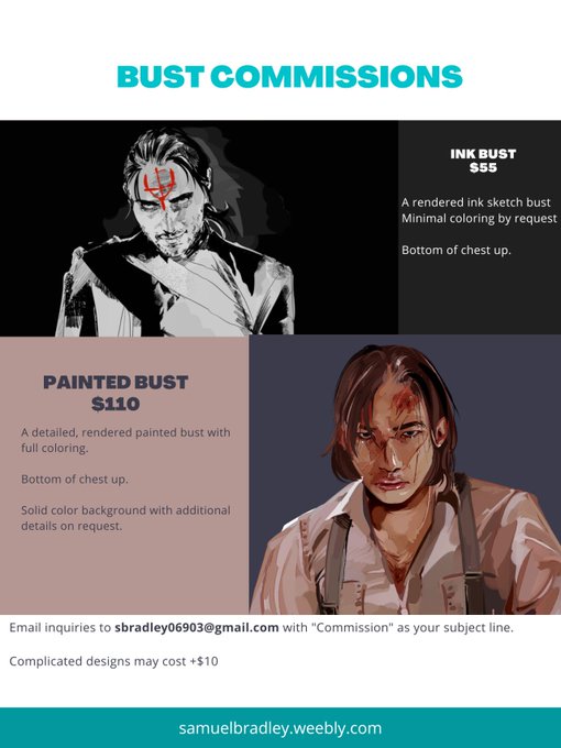 Bust C*mmissions open! 2 slots for 1-2 months. Ink: US$55, Painted: US$110 Payment up front through PayPal. Email sbradley06903@gmail.com for inquiries