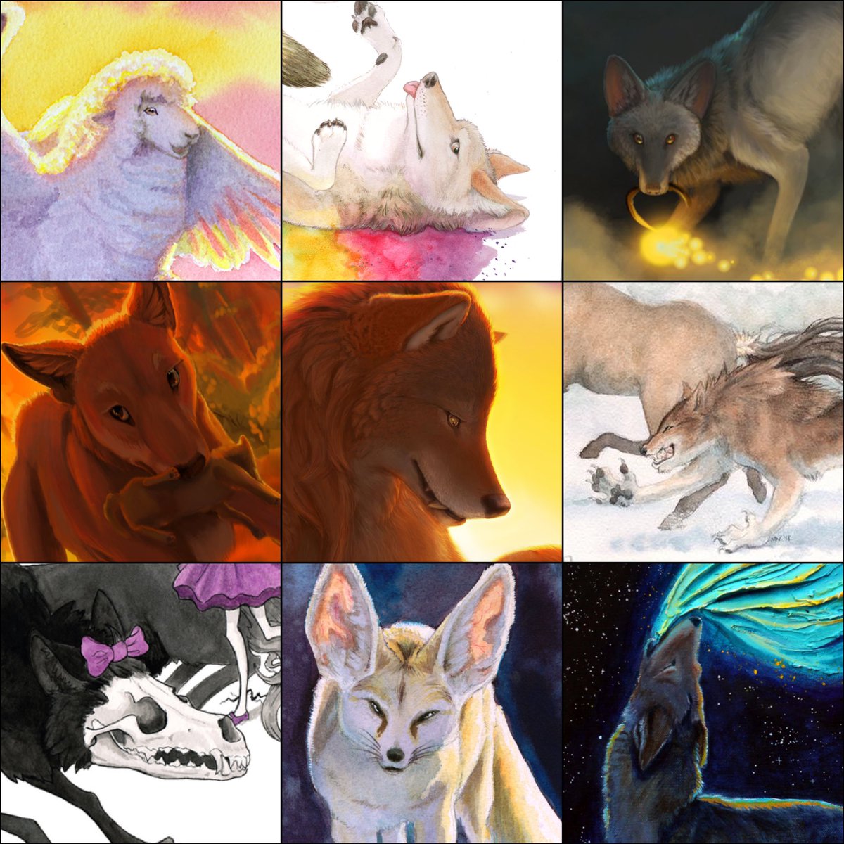 #faceyourart is trending, here are some of my favorite faces from paintings I’ve done :D The Dark doesn’t quite fit with the rest but it’s so cute in that bow I couldn’t resist adding them to the collage. #wolf #wolfart #fantasyArtist #AnimalArtist #werewolves #foxes