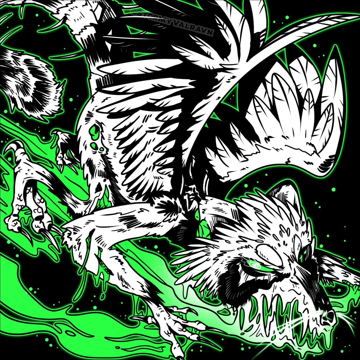 "First of the Stormy Abominations, a hybrid beast of raccoon and crow serves as a harbinger of a burning plague, bleeding green ooze wherever it lurks." #digitalart #inktober #artcommission #animals #halloween #artwork #raccoon #crow