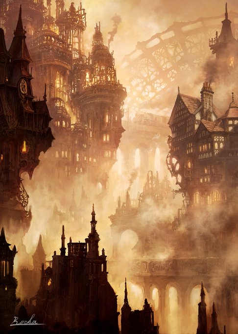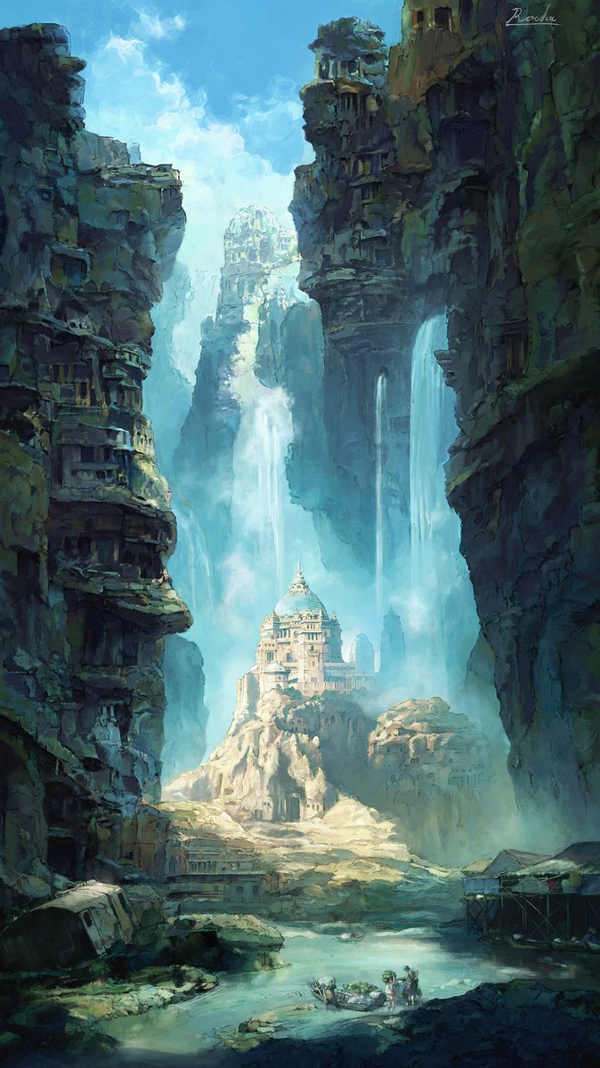 前回描いた絵の崖下(地下)のメイン居住エリア。 昔使われていた都市地下の建造物の空洞を利用して生活をしています。陸路が少ないので水路をフル活用。 #夏休みはフォロワーさんが増える #イラストレーターさんと繋がりたい
