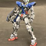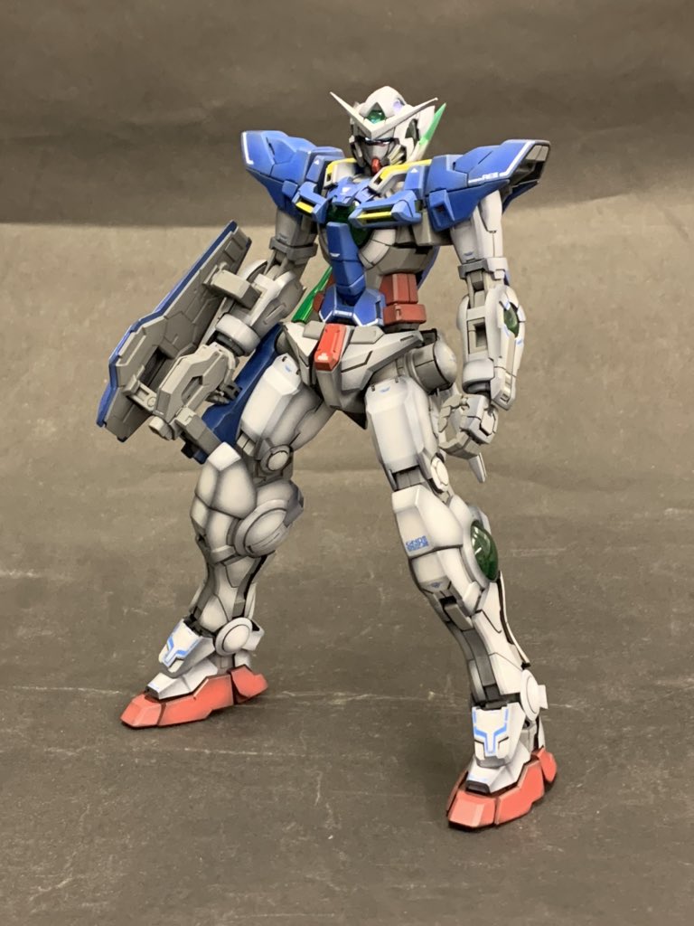 MGエクシアリペアⅡ ついに立った状態になりました! フレームのグレーは結局ベタ塗りに変更。顔も塗装した。顔のツノだけベタに近くなったから塗り直しとグレー部塗り忘れがあるから追加したい。 墨入れとデカール追加で完成 #ガンプラ #エクシア