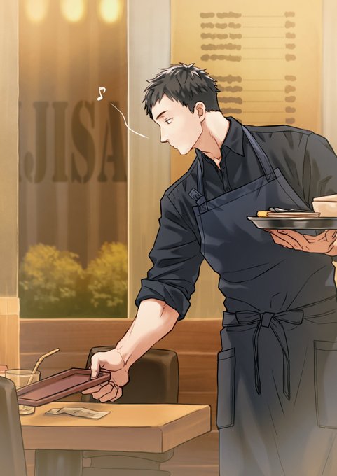 通信制限騒ぎでUP待ちしてたらくがき祭り最後の一枚 「スマニュー🖥️」 基本キッチンにいるけど暇になったら出てくるレア店員とかいいっすよね