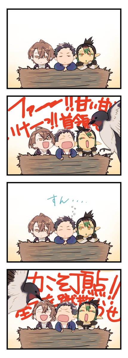 らくがき祭りの最中ですが昨日の雑キ見てたら描きたくなっちゃってェ 突然ファーゴル構文擦って静かになってまた共鳴して…て構図が、なんかエサ貰う時のツバメのヒナみたいだなって…