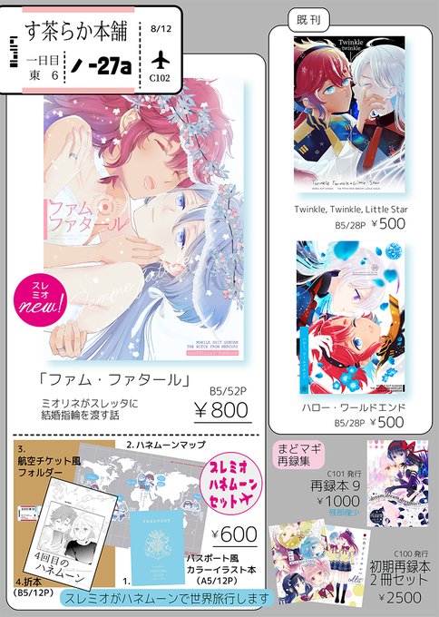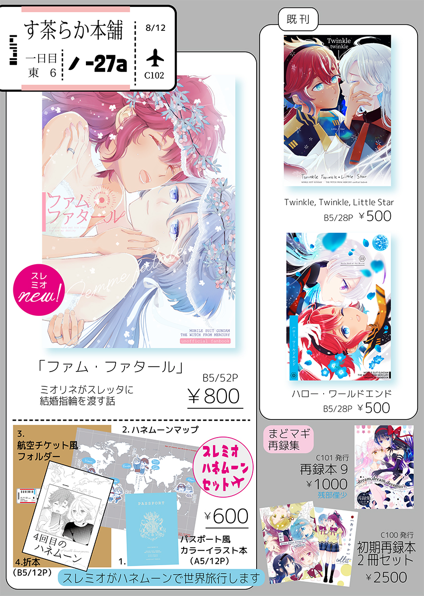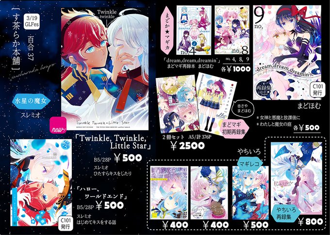 C101お品書きです【30日/シ56bす茶らか本舗】 新刊はまどマギ再録本、水星の魔女スレミオ本、マギレコやちいろ本です よろしくお願いします! webカタログwebcatalog-free.circle.ms/Circle/16815991 メロン●melonbooks.co.jp/circle/index.p… 虎の穴●ecs.toranoana.jp/tora/ec/cot/ci…