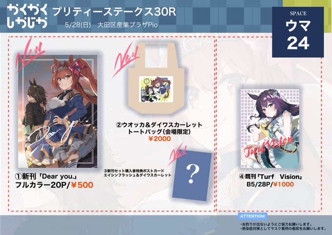 56 72 【#プリステ30R お品書き】 当日はえあ(@air_cos )さんと【ウマ24】にてお待ちしておりますー!! ※ポストカード付きの新刊セットは在庫少なめなので欲しい方はお早めに 23/05/23 18:00