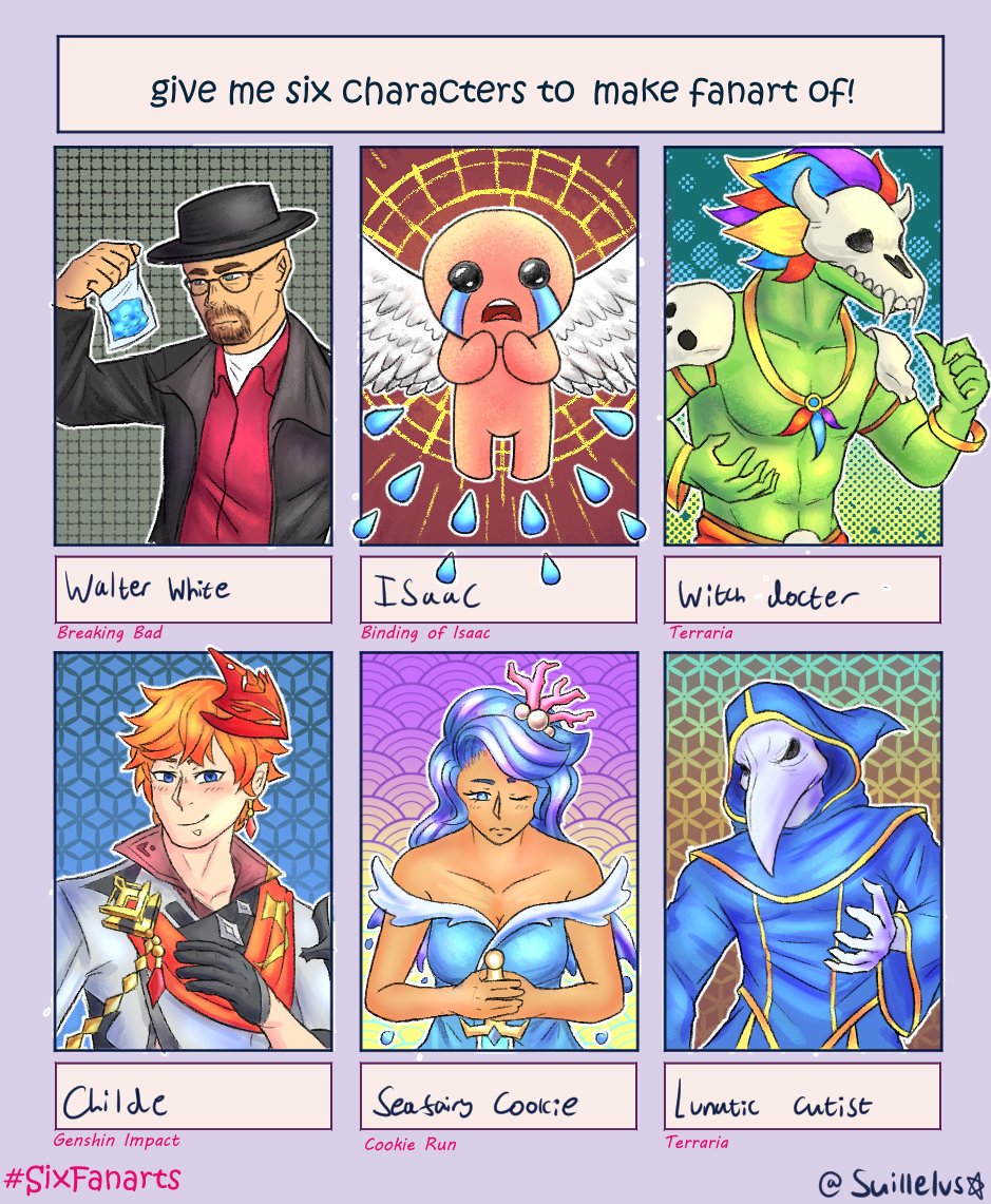 Wanted to do the Six Fanarts challenge for so long. So I took to Insta and here for suggestions. Thank you everyone who commented! it fun working on it as I went out of my comfort zone. <3 #sixfanarts #terraria #genshin #genshinimpact #breakingbad #cookierun #bindingofisaac
