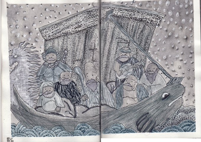 3. VESSEL La Takarabune 宝船 è la nave dei tesori del capodanno giapponese, condotta dai sette Dei della fortuna, gli Shichifukujin 七福神 #sumo #sumotoy #sumotoystudio #inktober #inktober2021 #blackandwhite #inkwork #ecoline #creative #artist #onedrawaday #gaybear #gaybearart
