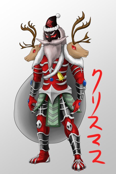 #オリジナル怪人 #イラスト HO HO HO !! メリイイィィクリスマァァァッス!!!!良い子の皆にも悪い子の皆にも、このクリスマス怪人サンタブラッドがプレゼントをあげようじゃないか!頭割り人形にビックリ爆弾箱、洗脳ゲーム機なんてのもどうだ!?好きなオモチャを選ばせてあげよう!HO HO !