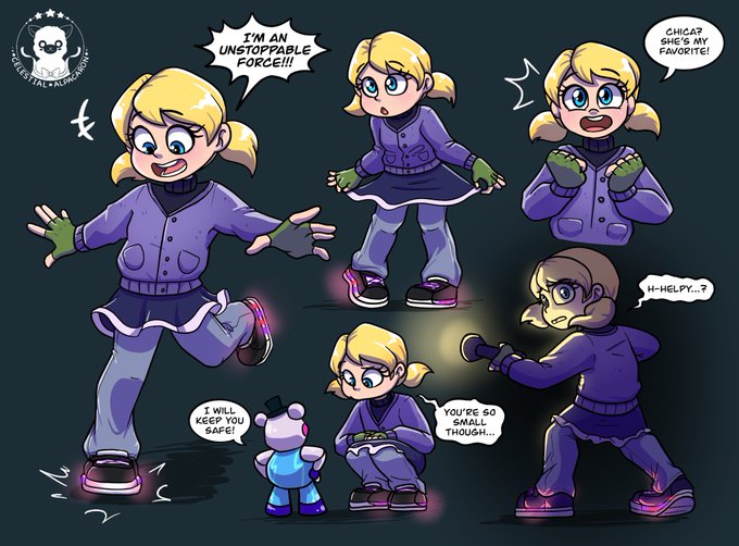 I like to think that Helpy probably survived the fire so he now kinda guides her around the Pizzaplex with his sworn duty to protect the small child. Oh and Chica is probably her favorite. #fnafsecuritybreach #fnaf #fnafsb #fnaffanart