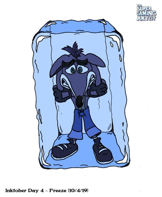 Inktober Day 4 - Freeze. I immediately thought of Crash being frozen in ice if you failed one of the ice levels while riding on Polar. I don't draw ice very much. I had to look up some reference on how to draw ice. #inktober2019day4 #inktober #inktober2019