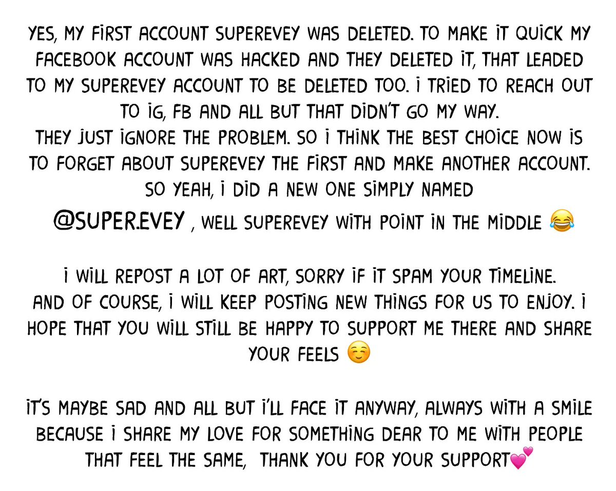 Like you maybe just read, my instagram account superevey was deleted. So if you still wish to follow me on IG here is the new link : instagram.com/super.evey?igs… or @/Super.evey Thank you 💕