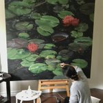 Finishing up. The truly exciting part of the painting process is that the artist can break the ‘rules’. I’ve placed these lily pads on a fairly even plane. I wanted them all to be featured and given the impression of cascading down the canvas. #waterlilies