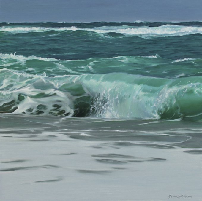 I finally took a proper photo of my latest seascape, Sapphire & Turquoise, 12x12 in. oil on #ampersandgessobord #seascapepainting