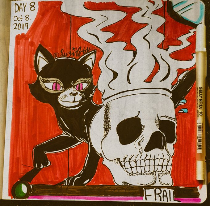 Day 8: Frail This Skull Cauldron is very anxious of falling and this sinister kitty senses the Skull Cauldron's Weakness. Bad Kitty. Also an extra concept of the evil cat. I don't know what should I call her. #Day8 #Frail #Inktober2019 #InktoberDay8 #Inktober #artsnackschallenge