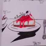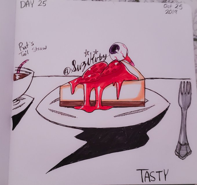 Day 25: Tasty A slice of Cheesecake with strawberries and an Eyeball on the top sure looks tasty. Also someone must have put a Straw that looks like a Rat's Tail on a cup of Coffee. #Day25 #Tasty #Inktober2019 #Inktober #artsnackschallenge #artsnacks