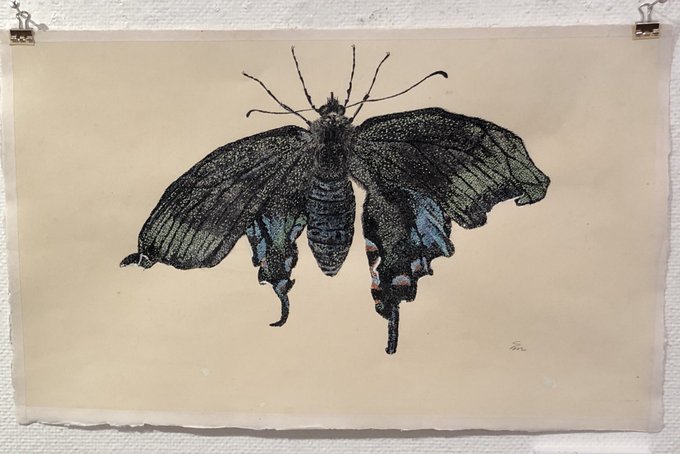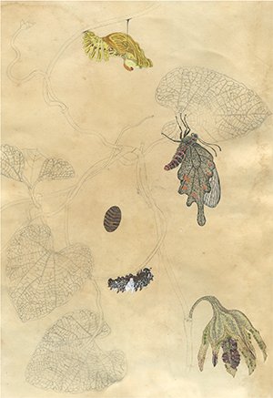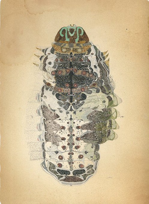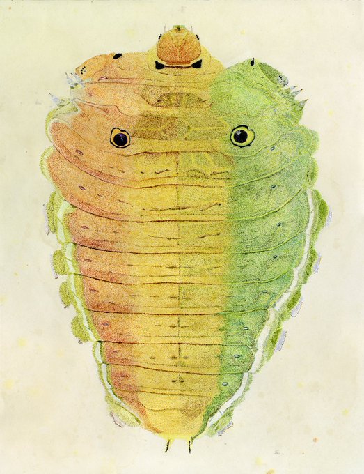 細見美術館のHPで作品をご紹介頂いています😊 新作はミカドアゲハ終齢幼虫🐛 体色の変化を展開図で描きました🌈 オレンジ→黄色→緑と美しく変化し、 今は緑の蛹となり、冷蔵庫で越冬中です😴 bit.ly/3ft9UHG
