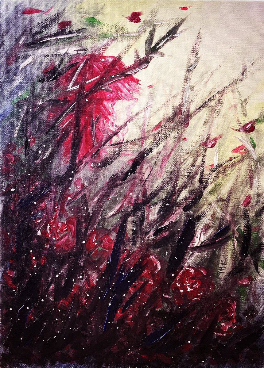 #薔薇 #油絵 #イラスト #アナログ 「荊棘の森」 闇と光 希望と絶望 生と死 対になるものってかっこいいよね 油絵の正しい描き方とか知らないから描きたいように描いたよ 人生3回目の油絵で学んだことは 床に座って描くと 尾骶骨が痛くなるってこと。