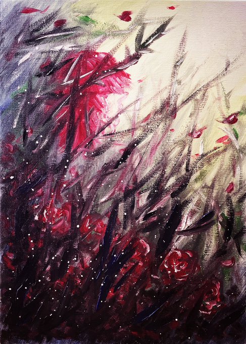 3 27 #薔薇 #油絵 #イラスト #アナログ 「荊棘の森」 闇と光 希望と絶望 生と死 対になるものってかっこいいよね 油絵の正しい描き方とか知らないから描きたいように描いたよ 人生3回目の油絵で学んだことは 床に座って描くと 尾骶骨が痛くなるってこと。 22/08/31 13:36