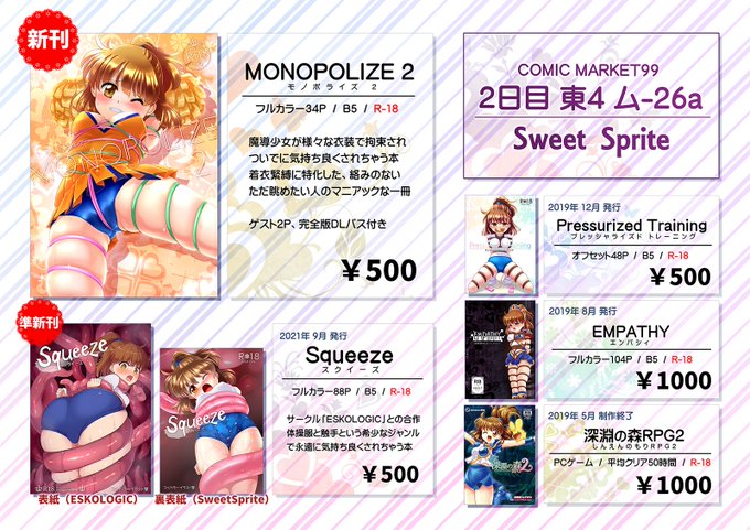 C99新刊「Monopolize2」(モノポライズ2) 様々な衣装で拘束されて気持ち良くされちゃうフルカラー本です。 今回に限り各書店と同時発売されます。(店舗&通販) コミケに来れない方はご利用ください。 とら:ec.toranoana.jp/tora_r/ec/item… メロン:melonbooks.co.jp/detail/detail.… 年明けに自家通販も行います。