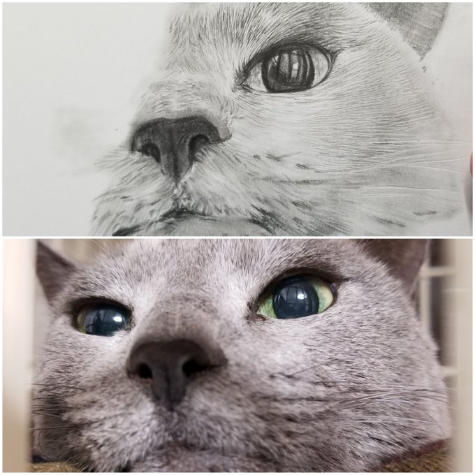 こにゃにちわ☀ 一昨日の配信でのリクエストで愛猫くろっペ描いてます❣紙をカリカリして鉛筆画乗せる方法で毛並みを書いてみたけど面白い⤴⤴毛並みが細かく表現できるので楽しい🎶途中段階だけど! #鉛筆画 #猫好きさんと繋がりたい #ロシアンブルー #絵描きさんと繫がりたい #芸術の秋