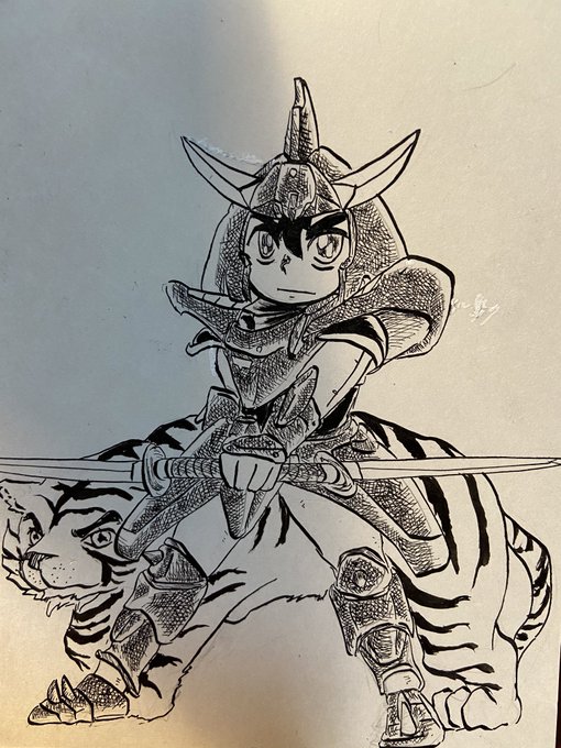 #Inktober2020 14.armor #サムライトルーパー 歳月は無常にて、あれ程集めた資料はボンボンコミックスを残すのみとなった。これでいいかな。 当時は魔将や白炎ばかり描いていたし、鎧ギアも避けていたので多分初リョウ。 同じ真田だし、隠月の太刀でよいのではないでしょうか。