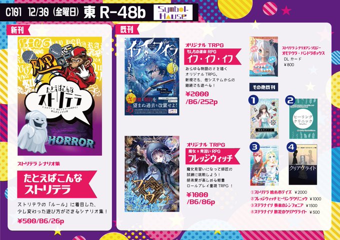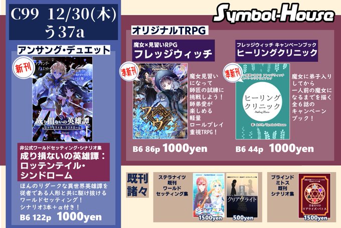 「Symbol-House」冬コミのおしながきはこちら! 【12/30(木・1日目)う37a】 新刊は #アンサング・デュエット 『成り損ないの英雄譚:ロッテンテイル・シンドローム』! 準新刊はオリジナルTRPG #フレッジウィッチ とそのシナリオ集! ステラナイツとブラインドミトスの既刊もあるよ! #C99 #TRPG